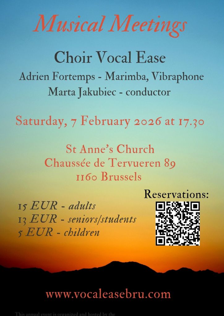 Vocal Ease cordially invites you to its upcoming concert: “Musical meetings”, where, together with percussionist Adrien Fortemps, we will present a diverse programme for choir and percussion. We will take you on a journey from the Renaissance – with madrigals accompanied by drum and sacred motets by Orlando di Lasso – to the famous Ave Maria by Bach-Gounod in an original setting for solo soprano and marimba, and on to 20th-century music, featuring true gems of the women’s choral repertoire, such as Ave Maria by Zoltán Kodály.